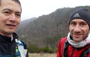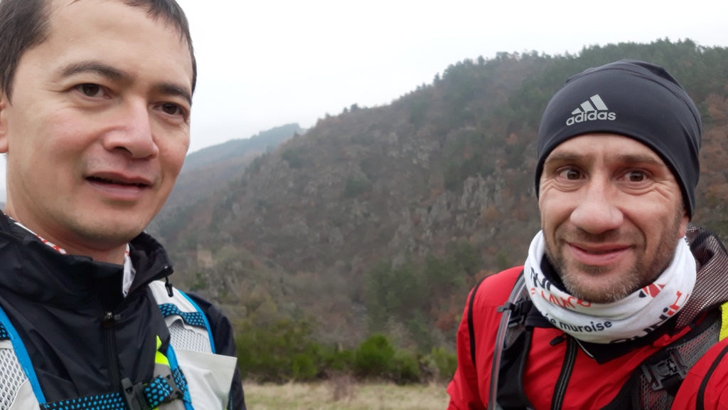 8h10 Avec plus de 30mn après le chrono de 2016, nous voilà à Monistrol. Je me change du haut en grignotant les minis sandwiches au pâté, complète le camelback avec une dose de poudre énergétique. Tout va bien, aucune douleur anormale, si ce n'est une petite contrainte dans le dos. La dernière partie du parcours est assez monotone, je me prépare psychologiquement en me projetant un peu plus loin, vers les crêpes à 5km de l'arrivée. Les 3km de route à la sortie de Monistrol en paraissent 10 ! Il y a très peu de concurrents à 300m devant nous, 5 ou 6 tout au plus, pas question de qu'on se fasse doubler maintenant ! On arrive à doubler une randonneuse, mais dès la montée suivante, elle nous rattrape et nous dépasse facilement, c'est injuste ! Nous zappons la ravito de la Chappelle-d'Aurec (court passage juste pour avoir le tampon), j'ai des bonnes sensations en montée, et j'arrive à trottiner facilement sur le plat ou en descente maintenant. La descente vers Lafayette se fait attendre, mais mon moral est bon, je pense ressentir les bons effets des derniers ravitos et de pouvoir mieux m'alimenter en courant sans 2 paires de gants à enlever ! Malgré une petite baisse de régime dû à un mollet contracté, Pascal suit bien, et nous rattrapons plusieurs concurrents dans la descente de la vallée, et nous nous permettons enfin un petite selfie ! Les couleurs d'automne sont aussi magnifiques que dans mes souvenirs, comme le petit pont que nous traversons avant de remonter tranquillement.
