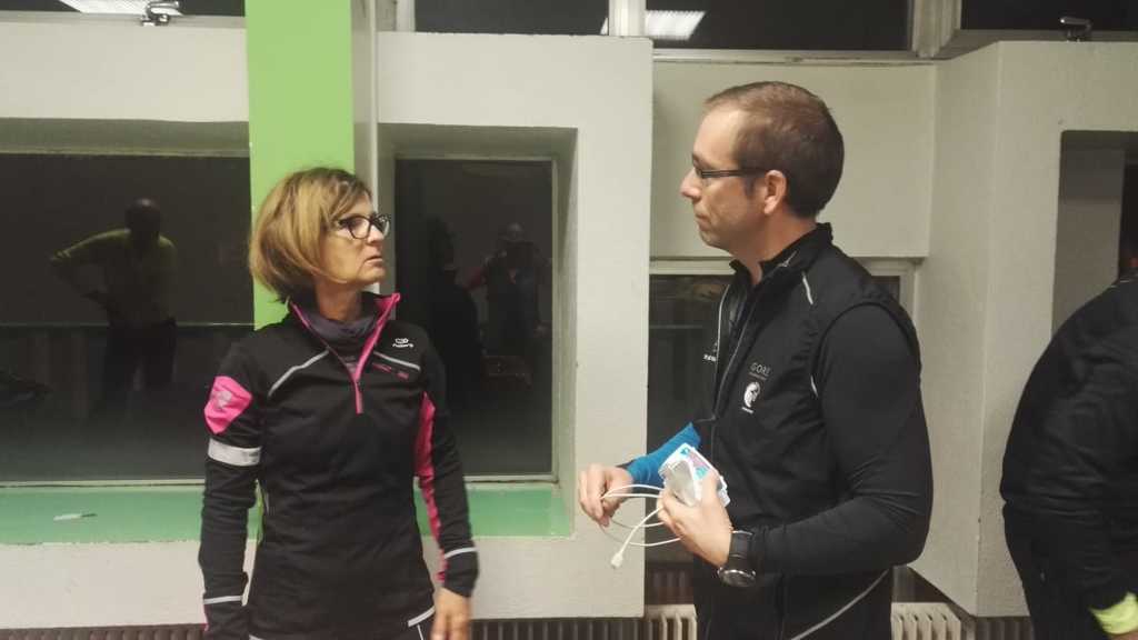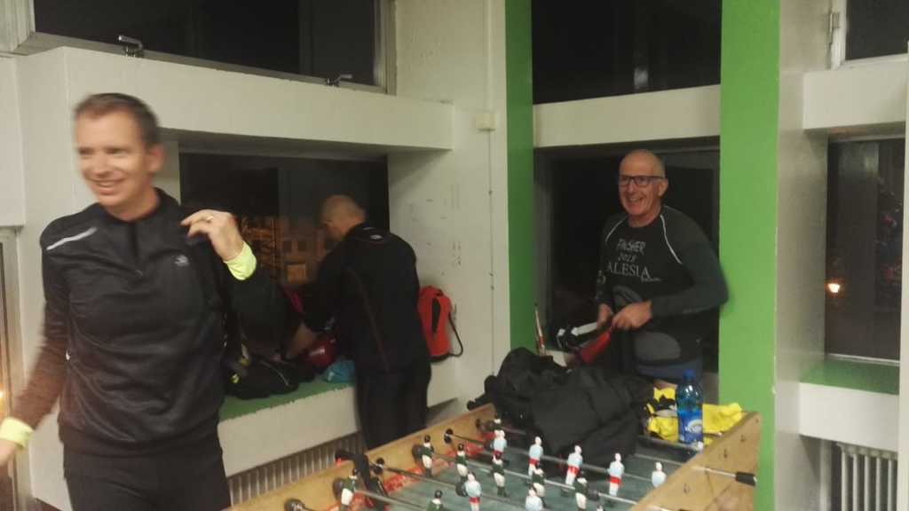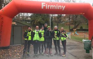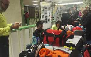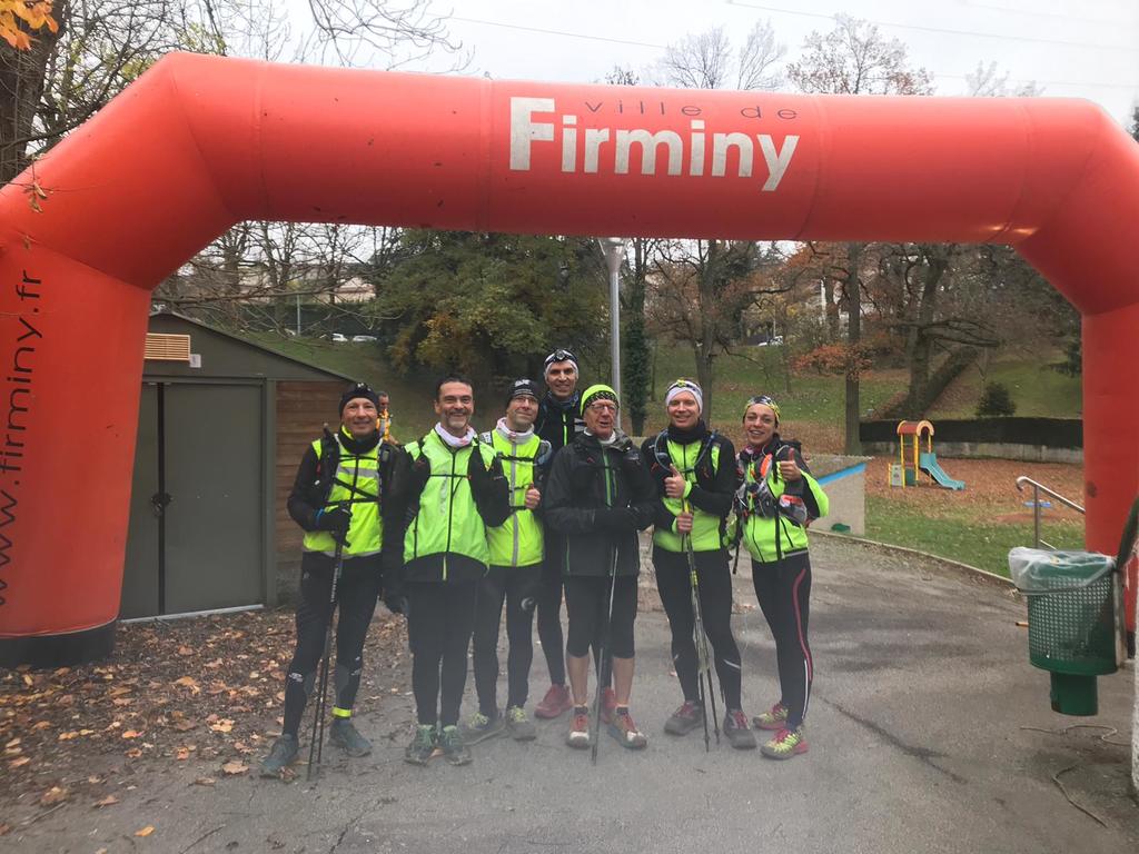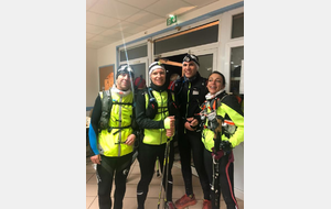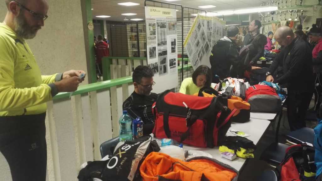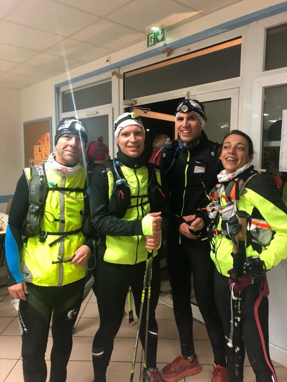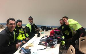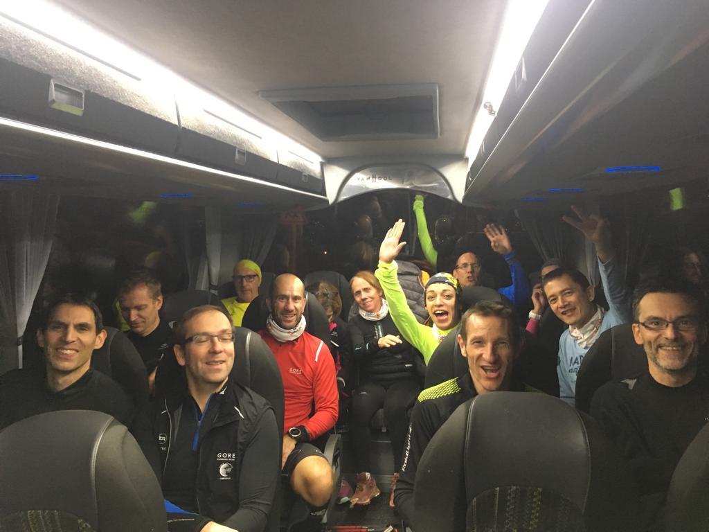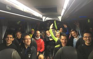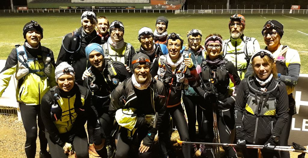 21h45 Je suis comme à mon habitude déjà équipé, et comme d'autres, je laisse le sac de change sur place. Il fait bon, je décide de ne pas m'encombrer de la deuxième paire de gants. Nous montons dans le 3ème car, 16 tortues au fond, ça s'entend, surtout avec radio Ophélie ! Les anciens, ceux qui ont déjà fait le raid plusieurs fois (Jacques, Danielle, Dom), et qui ont l'habitude de profiter de l'heure de navette pour se reposer vont avoir du mal à fermer l'oeil ! D'autant qu'à l'approche du Puy, un barrage filtrant rajoute un petit coup de stress. Finalement, nous arrivons au stade du Puy dans le bon timing, juste le temps pour chacun de s'équiper dans les vestiaires surchauffés, puis la photo de groupe (sans Claude que je n'ai pas encore vu, et Reynald caché dans la poche de Danielle sans doute 😊), et après 2 tentatives de départ au pistolet ratées, nous voilà lancés dans la nuit.