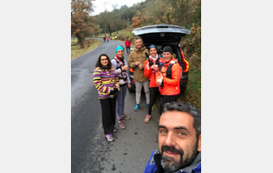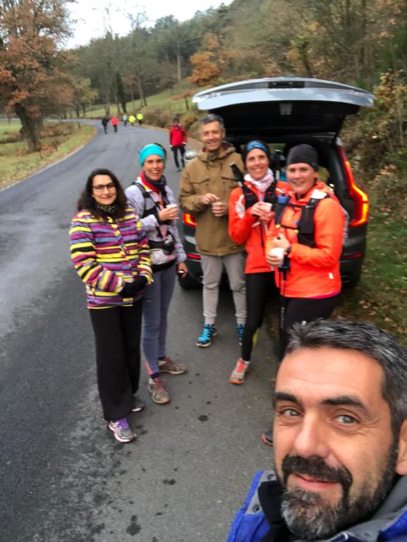 4h40 Comme prévu, impossible de trottiner pendant 10mn, la collègue de Laetitia nous rattrape. "C'est vrai que t'as fait le marathon ce matin ?". Ben ouais, et c'est pour ça que je ne suis pas capable de courir maintenant ! Elle s'échappe ensuite rapidement. Prochaine étape dans le viseur : ravito à Confolent. Mais d'abord une bonne descente sur route, puis prudemment dans les bois détrempés (je les avais traversés comme un dératé il y a 2 ans). Je pense retrouver nos accompagnateurs à la sortie du bois à l'entrée de Bransac, mais en réalité c'est 2km plus loin, après une interminable montée sur la route. Le courageux trio se cache dans la voiture pour ne pas se faire taxer par les autres concurrents ! Mais pour nous, c'est open bar 😆. Une nouvelle portion de soupe et de pain d'épices pour moi. D'autres concurrents s'arrêtent aussi et se voient bien accueillir malgré tout par nos anges gardiens. Nous repartons vite pour ne pas qu'ils se fassent dévaliser !