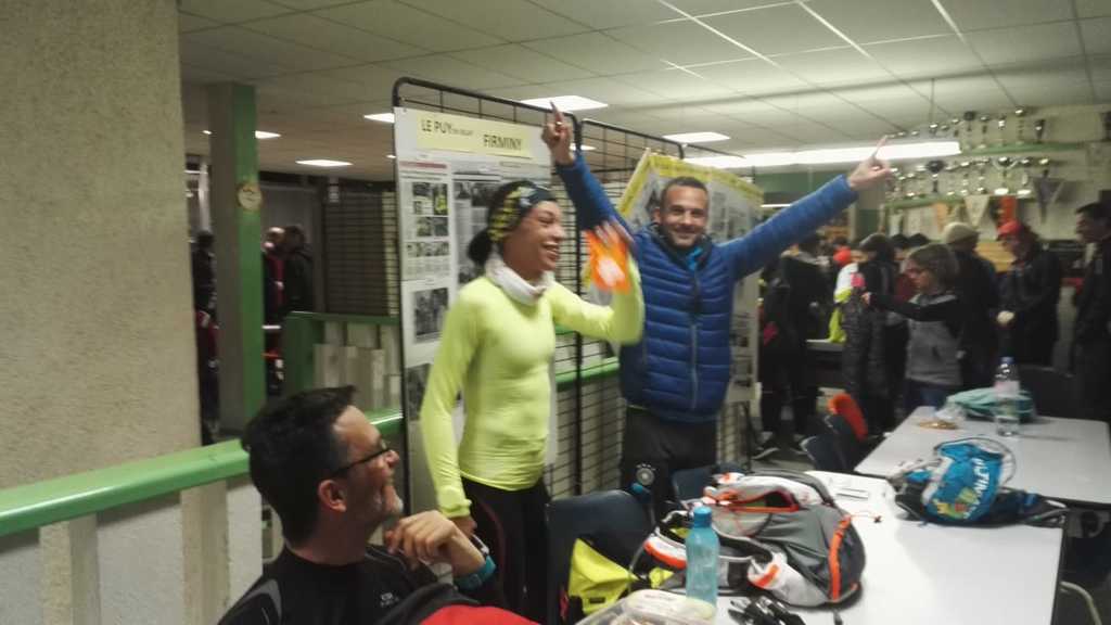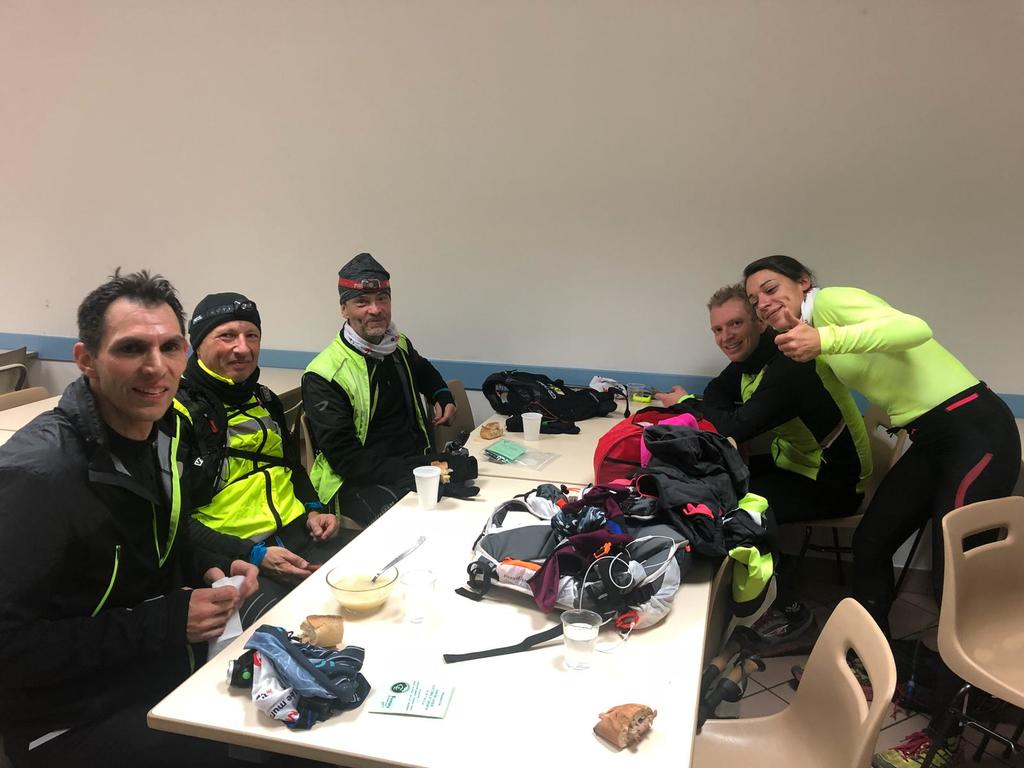 4h15 Nous arrivons au ravito du gymnase de Baux. C'est 15mn de plus que la dernière fois, l'objectif horaire de 11h est donc dépassé, on arrivera à Firminy sans doute entre 11h30 et 12h si tout va bien. On retrouve le groupe de Danielle, Reynald, Cédric, Dom, Véro et Jacques sur le point de repartir, ainsi que notre trio d'assistance VIP. Je quémande rapidement ma soupe de vermicelles (VER-MI-CELLES je répète 😉), que j'accommode avec plein de pain. A notre table, une collègue de Laetitia se pose pour se restaurer aussi, c'est son premier long, elle a l'air bien plus fraîche que moi. À l'autre bout, je vois Rémi, le copain qui était avec nous à Saint-Jacques, assis par terre, pas bon signe, il s'arrêtera là. J'ai peur d'avoir trop froid si je prends le temps d'un deuxième bol de soupe, je me force à croquer la moitié d'une barre énergétique protéines, avant de repartir accompagné de mon garde du corps Pascal.