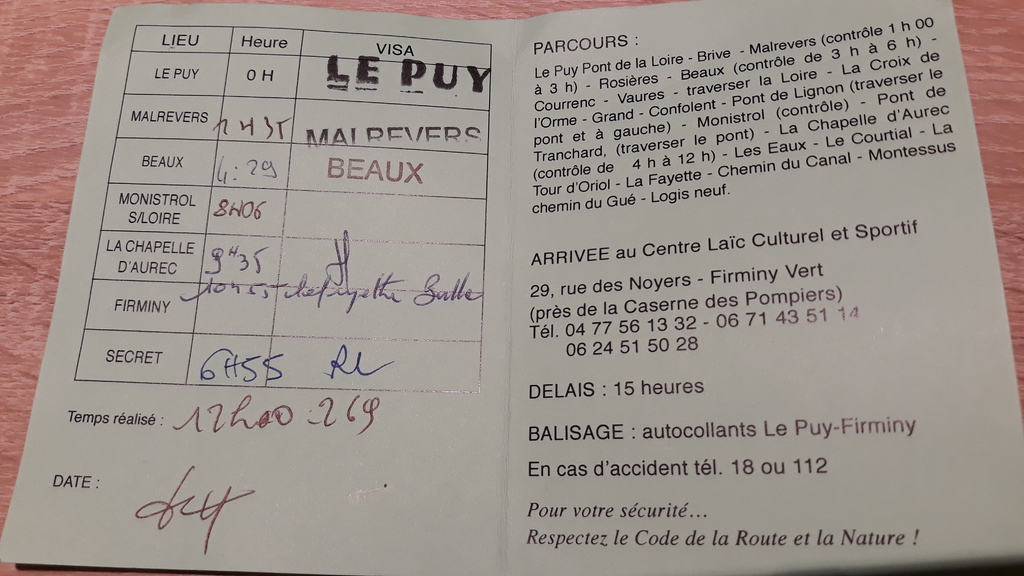 6h50 Les presque 3km de descente vers Confolent sont cassants. Je ressens la faim, l'objectif au bar des boulistes est de me recharger sans trop me refroidir. L'ambiance dans le bar est chaleureuse mais la différence de température avec l'extérieur est trop importante. Je prends croissant et pain au chocolat pour les déguster dehors, je retourne boire, et stocke un demi pain au chocolat pour la suite. Pascal montre quelques signes de fatigue, mais c'est surtout la nuit qui le pèse, il attend impatiemment la levée du jour, qui arrive enfin quand nous sortons de Confolent. A partir de ce moment, nous nous faisons régulièrement doubler par les concurrents de Baux-Firminy, tout frais ! Ça remonte bien, et au bout nous voyons d'en haut Monistrol, avec la longue ligne droite plate, puis montante. Replongé dans mes souvenirs de 2016, et sans doute remotivé par la lumière du jour, je cours non stop d'un bon rythme jusqu'au ravito, surprenant un peu Pascal par ce regain (momentané) d'énergie. Nous croisons dans le centre le trio d'assistance qui repart à la rencontre des 3 tortues alignées sur le parcours Baux-Firminy, ainsi que Guy, mari de Dom, en partance pour Firminy.