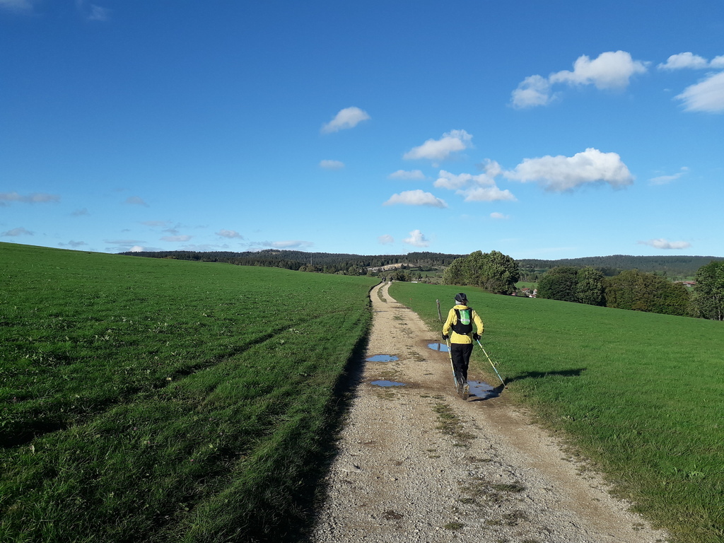 Le prochain ravito se trouve à Mouthe, village le plus froid de France. Pourtant quelques rayons de soleil transpercent les nuages, les paysages sont magnifiques ! Je me retourne régulièrement pour en profiter et m’emplir d’ondes positives.